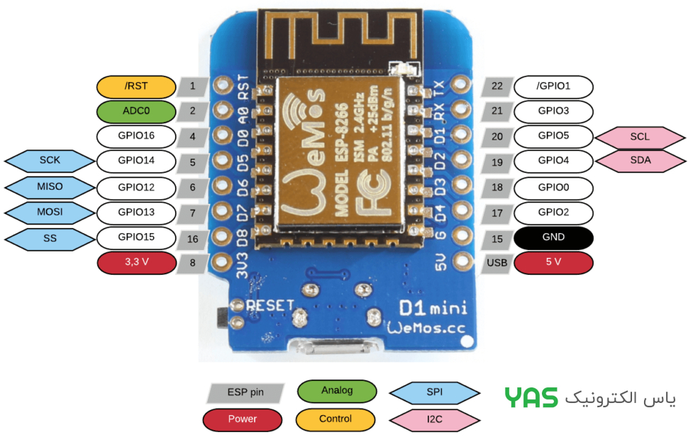 WeMos D1 Mini یک برد وایفای ارزانقیمت مبتنی بر ESP8266 است که ابعاد کوچکی دارد اما به اندازه هر میکروکنترلر NodeMCU یا ESP8266 قدرتمند است. D1 Mini به دلیل قیمت پایین، پشتیبانی از وایفای و سازگاری کامل با پلتفرم آردوینو، فوقالعاده همهکاره است.