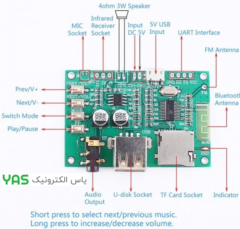 پشتیبانی از رمزگشایی فرمت MP3، WAV، WMA، FLAC، AAC، APE. حداکثر پشتیبانی از فلش مموری USB 128 گیگابایتی و کارت TF، پشتیبانی از حافظه نقطه شکست و عملکردهای حافظه آهنگ. نسخه بلوتوث 5.0 از HFP/A2 DP/AVRCP/HSP/ GAVDP/IoP/SPP/BLE با فاصله حدود 10 متر پشتیبانی میکند.پشتیبانی از دریافت نام کامل فایل پخش، مسیر مشخص شده پورت سریال، پخش، حلقه یا پخش تکی. پشتیبانی از عملکرد ضبط 128KBS. ضبط روی کارت TF یا دیسک U، ضبط، حذف پخش و غیره.
