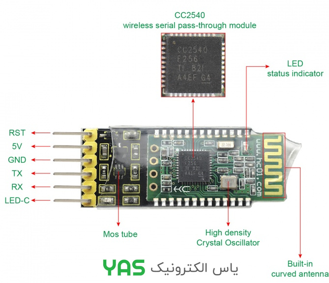 این ماژول از تراشه CC2540F256 از TI استفاده می‌کند که با ۲۵۶ کیلوبایت فضا پیکربندی شده و از دستور AT پشتیبانی می‌کند. در صورت نیاز، کاربران می‌توانند نقش (حالت اصلی یا فرعی)، نرخ انتقال داده پورت سریال، نام دستگاه و سایر پارامترها را تغییر دهند و استفاده از آن بسیار انعطاف‌پذیر است.